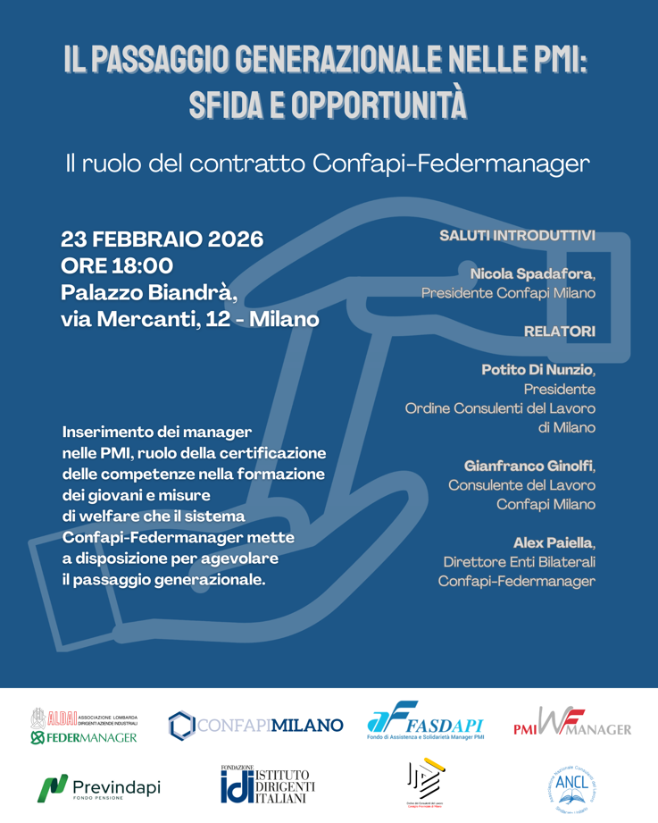 Evento organizzato da: Confapi Milano, ALDAI Federmanager, Fasdapi, Previndapi, PMI Welfare Manager, Ordine dei Consulenti del Lavoro – Consiglio Provinciale di Milano, ANCL, Fondazione IDI.
